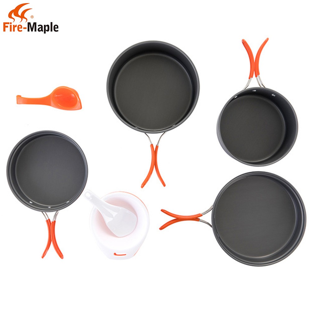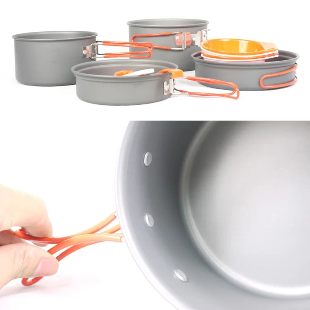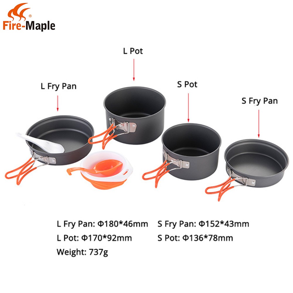A set including utensils covers general activities without compromising on weight for mobility. Nested design compacting the entire set into one. Practically designed both pan can be dual used as lid when needed. Made of layered hard-anodized alloy featuring with easy clean, abrasion resistant & durability. Precisely constructed assuring every parts dependable. Every utensil comes with fold-away insulated handle. Experience joyful outdoor cooking.