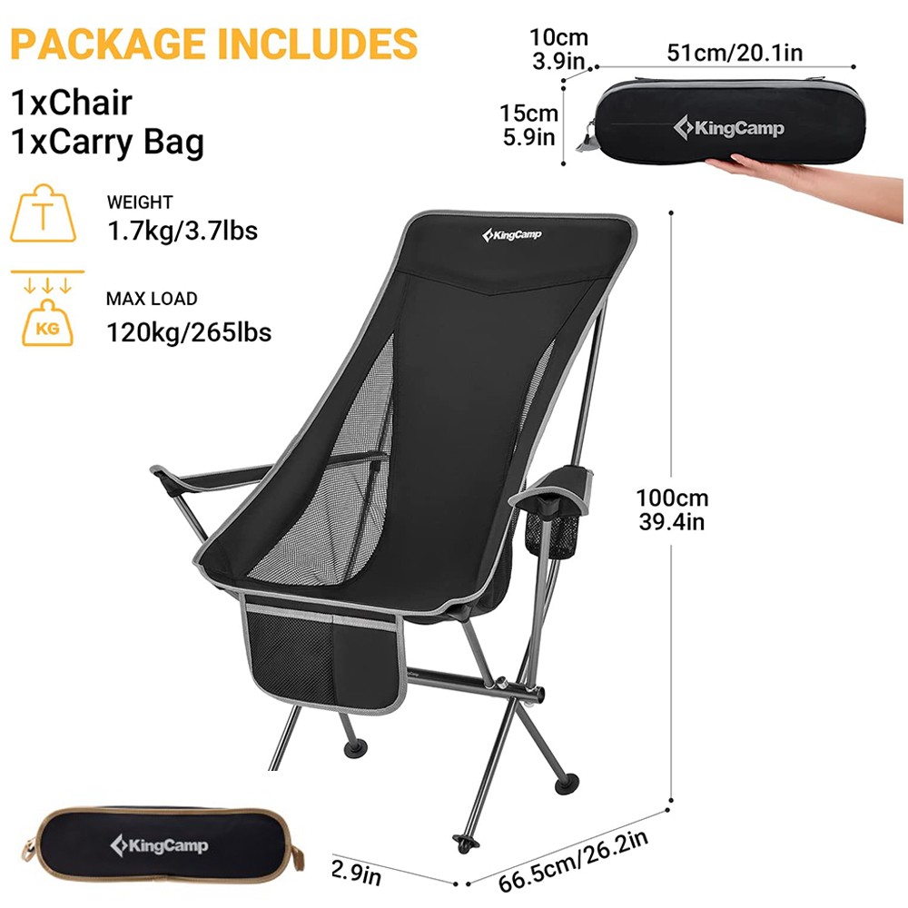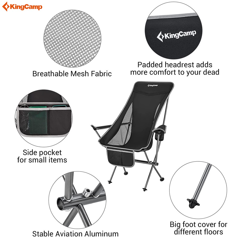 KingCamp lightweight folding chair is a high back style, with a padded headrest that can provide you full support for the back, neck, and head, which is more suitable for extended time rest in outdoor activities such as garden patios, music festivals, concerts, park, barbeque, tailgating, trekking, cycling, climbing. Its foldable, lightweight, and compact structure makes it easy to carry and store. Durable material makes you reliable to relax. Besides, breathable mesh material can make you feel cool in a hot climate, and the added pocket can store your belongings. The cup holder can keep your drinks at hand. Your comfortable and wonderful outdoor experience is our greatest wish.