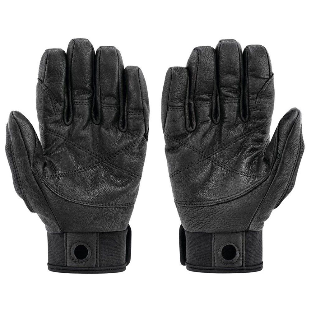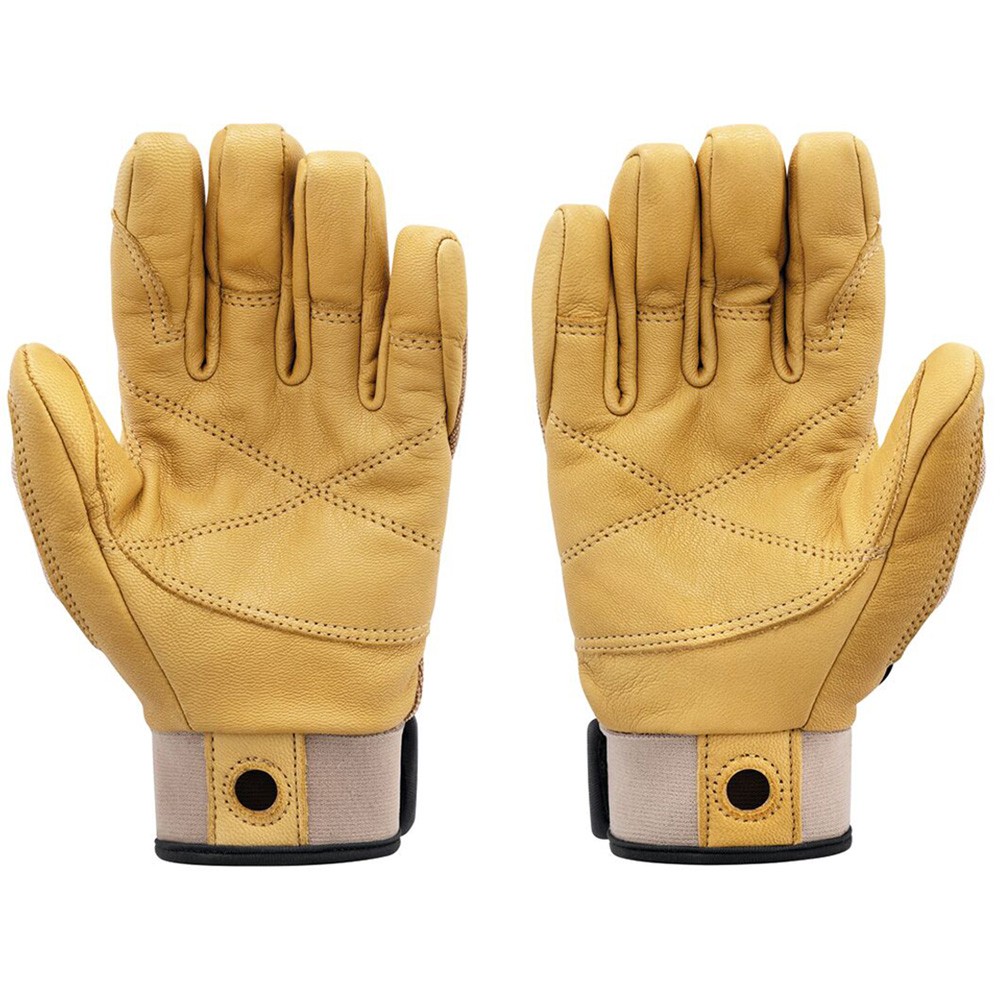 These lightweight belay/rappel gloves combine the durability of a work glove with the precise fit and dexterity of a thinner glove. Double-layered leather protects the palm and other high-wear areas. The back is made of abrasion-resistant, breathable stretch nylon, providing comfort and fit. The low profile neoprene cuff with Velcro closure features a reinforced carabiner hole for attaching the gloves to your harness.