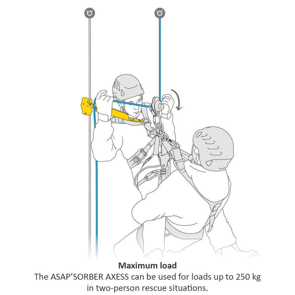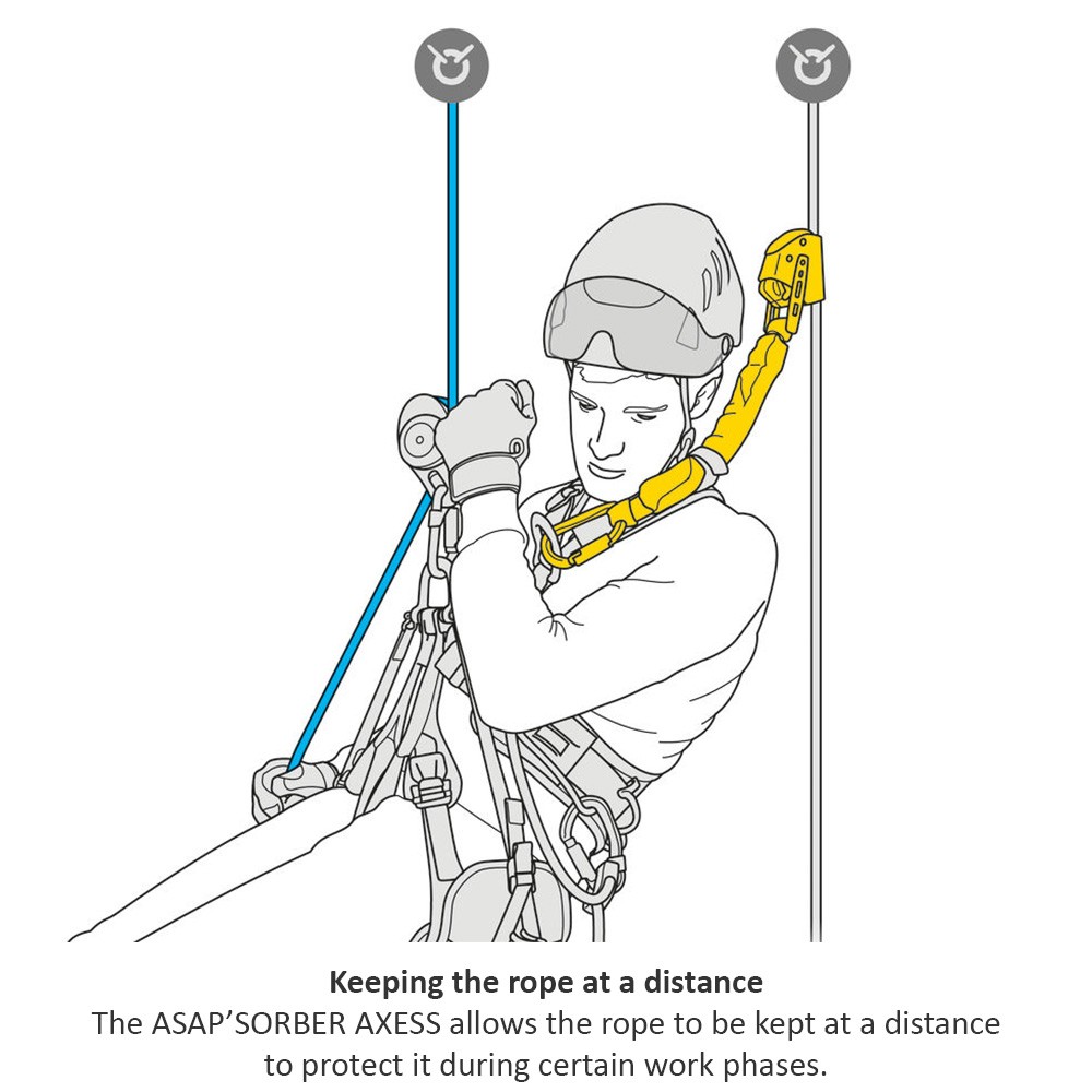The ASAP’SORBER AXESS energy absorber may only be used with the ASAP or ASAP LOCK mobile fall arrester. It allows user to work at a distance from the rope, in order to protect it during certain work phases. Equipped with tear-webbing inside a pouch that opens on each end, the absorber is protected from abrasion, while allowing for regular inspection. In can be used in two-person rescue situations for a maximum load of 250 kg.