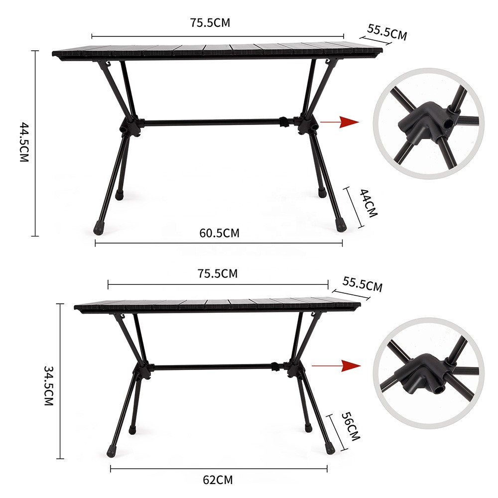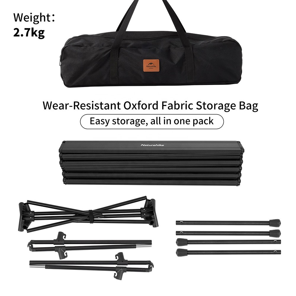 The FT11 Naturehike CNH22JU037 folding aluminum picnic table is compact and sturdy. It can also be adjusted in height to suit many different purposes, and can be used with many types of chairs of different heights. It can be fixed at 34.5 cm or 44.5 cm height. Both the frame and the tabletop are made of aluminum alloy. The legs of the table are equipped with anti-slip pads.