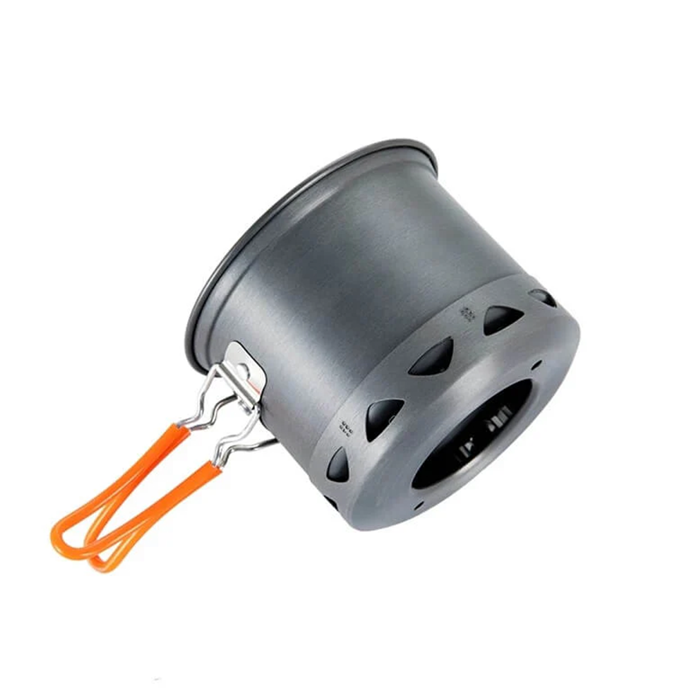 It can hold a 220g gas canister and a stove, suitable for day hikes for 1 or 2 people. The foldable handle is covered with a layer of silicone to prevent burns . The heat exchanger on the bottom can increase the heat efficiency rate by 30%, which increases the efficiency of fuel utilization and saves.