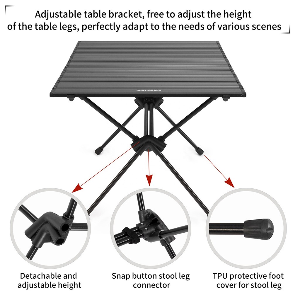 The FT11 Naturehike CNH22JU037 folding aluminum picnic table is compact and sturdy. It can also be adjusted in height to suit many different purposes, and can be used with many types of chairs of different heights. It can be fixed at 34.5 cm or 44.5 cm height. Both the frame and the tabletop are made of aluminum alloy. The legs of the table are equipped with anti-slip pads.